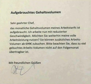 in unserem Arbeitsvertrag ist eine wöchentliche Arbeitszeit vereinbart. Das monatliche Gehaltsvolumen erreicht die Maximalgrenze der sich daraus ergebenden Arbeitsleistung und ist damit aufgebraucht. Ich erbringe ab dem Tag dieser Information zu Grunde liegenden aufsummierten Arbeitszeiten1 maximal eine Anwesenheitsleistung im MobileOffice bei eingeschaltetem, nicht angemeldetem Firmen-Rechner. Die Anwesenheitsleistung ist nicht verhandelbar und beschränkt sich auf die Zeiträume zwischen den Zwischenmahlzeiten zwischen Frühstücks- und Mittagspause.
