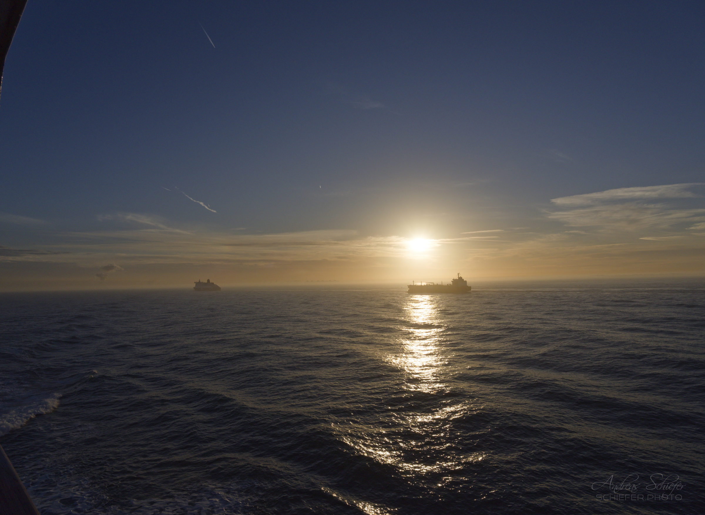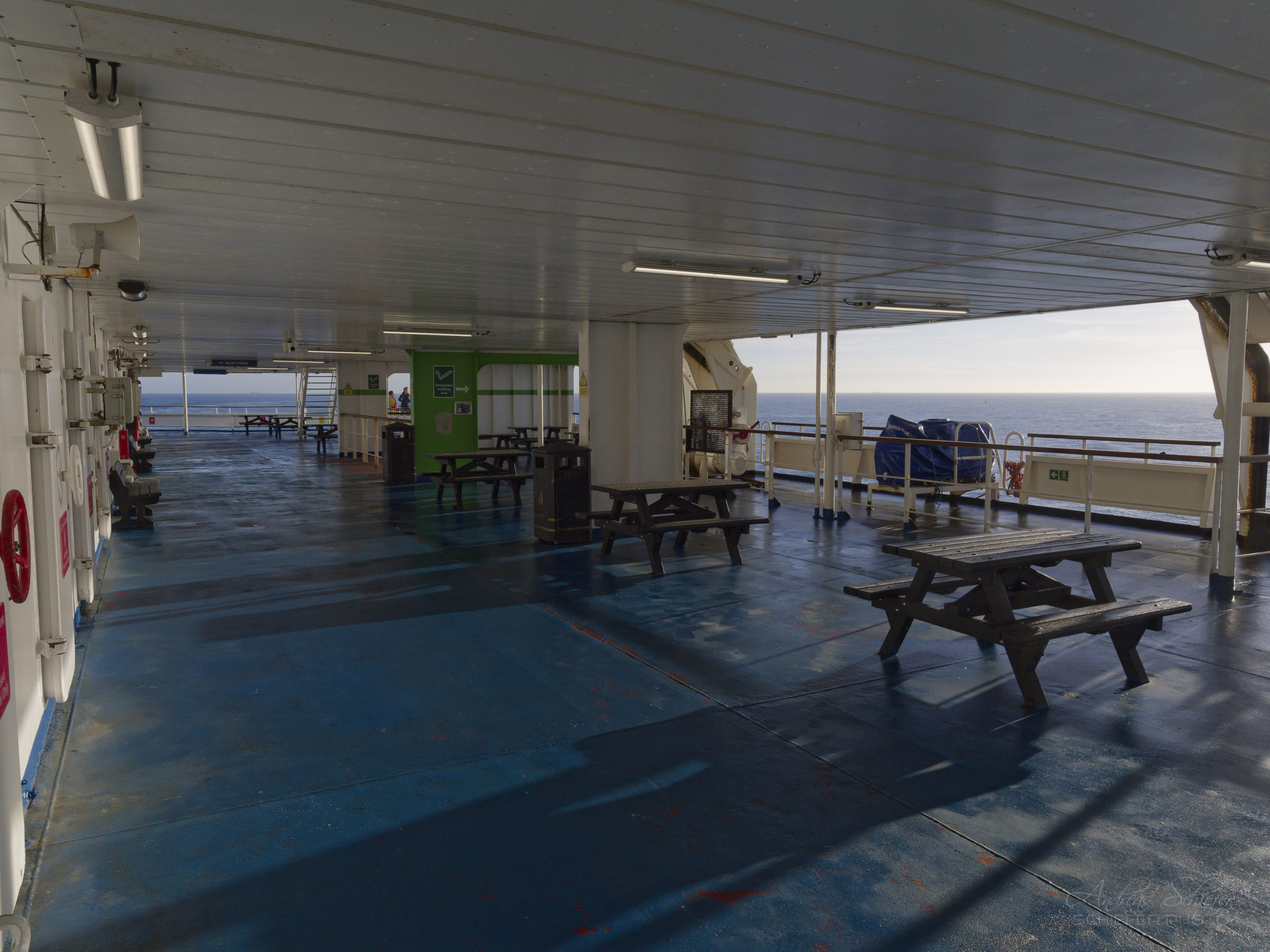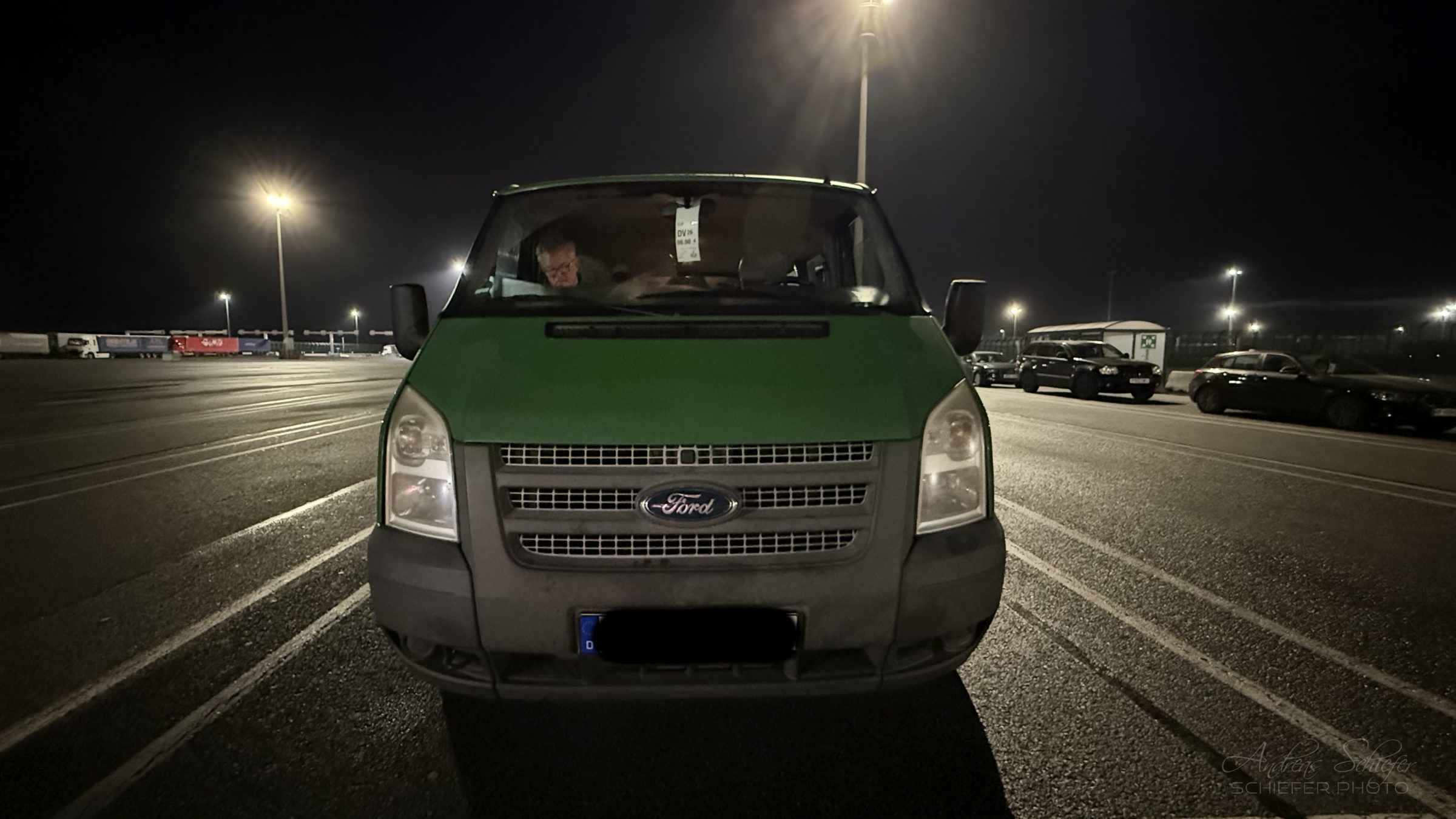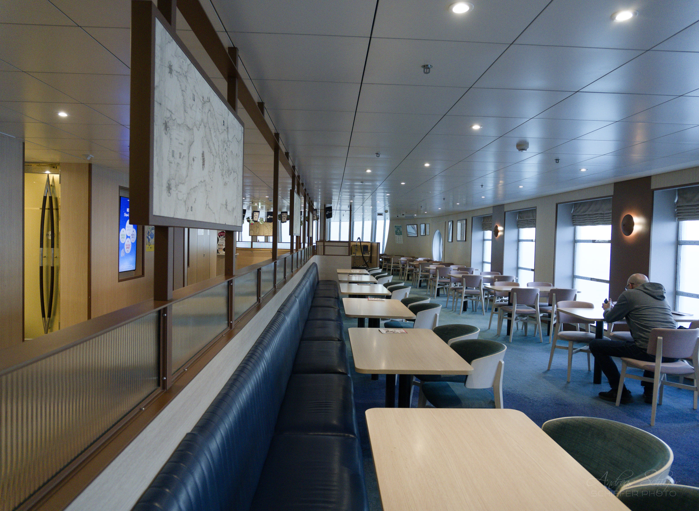 Zunächst fuhren wir vom Hotel zum Hafen. Während der Einfahrt wurden wir 4x kontrolliert. 3 x Pässe, einmal das Fahrzeug. Dann standen wir fast 45 Minuten in der Spur 26. Links neben uns füllte sich ein wenig die PKW-Reihe. Während die LKW-Reihen deutlich höher belegt waren. Schließlich wurden wir auf die Fähre gewinkt und stellten den Transit auf Ebene 4 ab. Von dort gingen wir auf Deck 6 und gönnten uns sowas wie ein Frühstück. Relativ bescheidene Auswahl. English Breakfast halt.