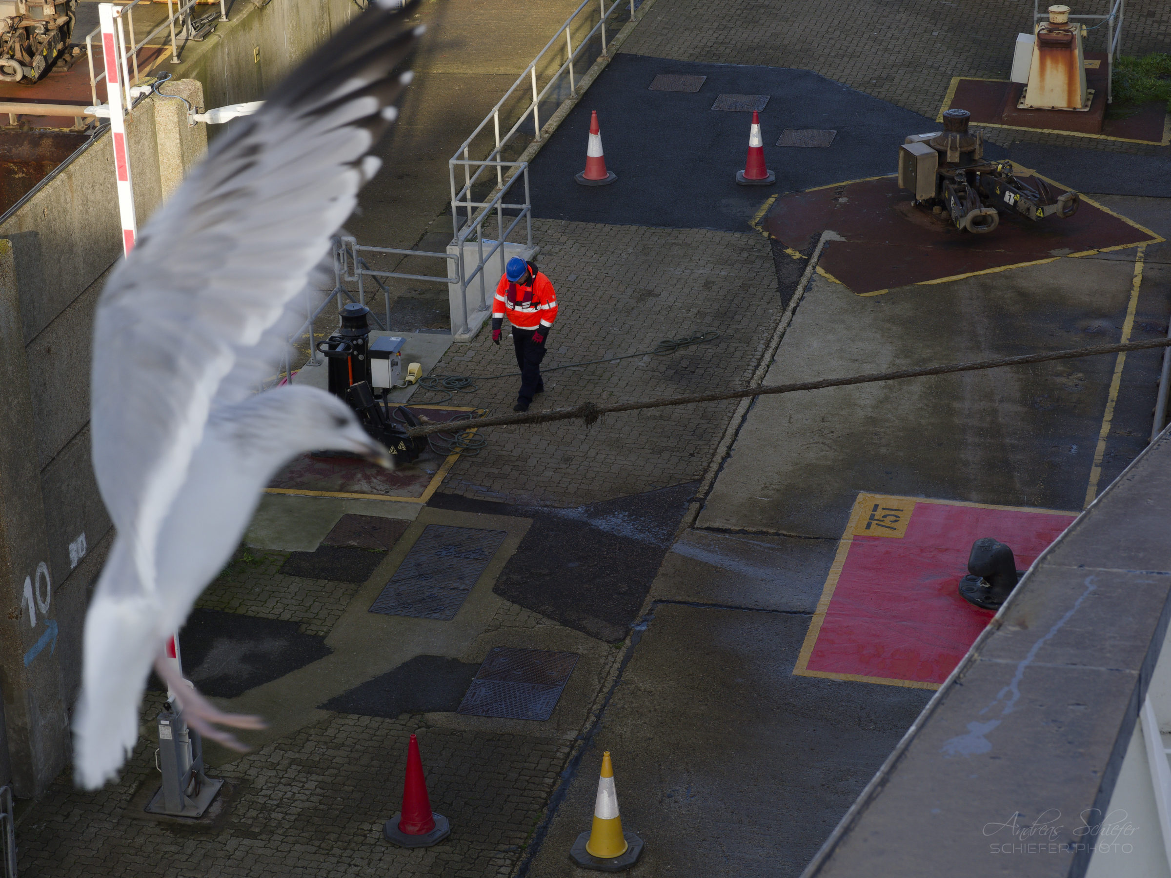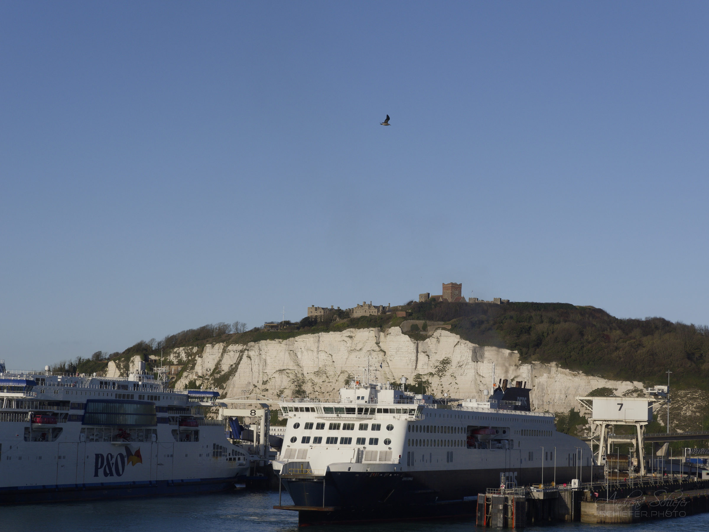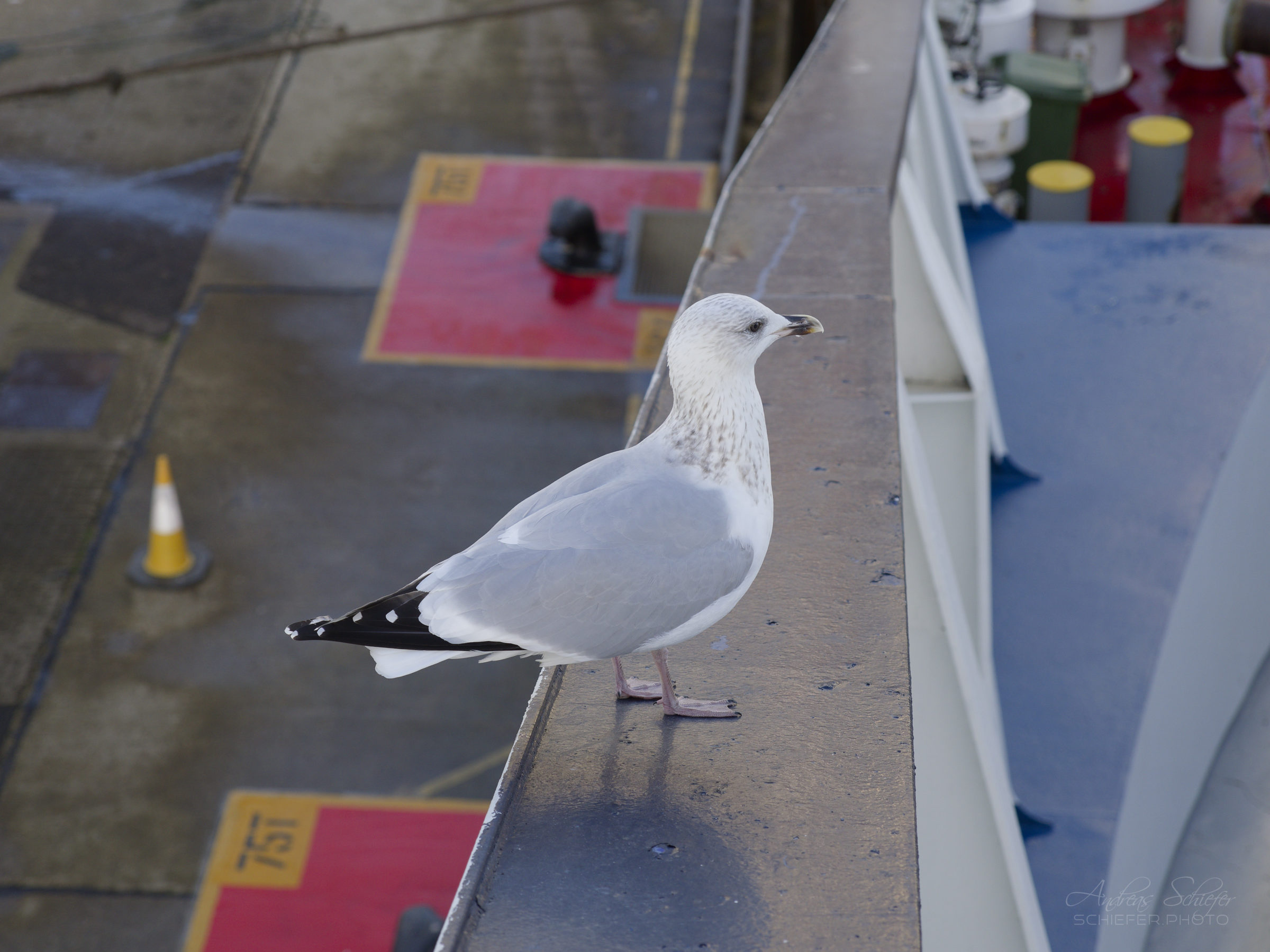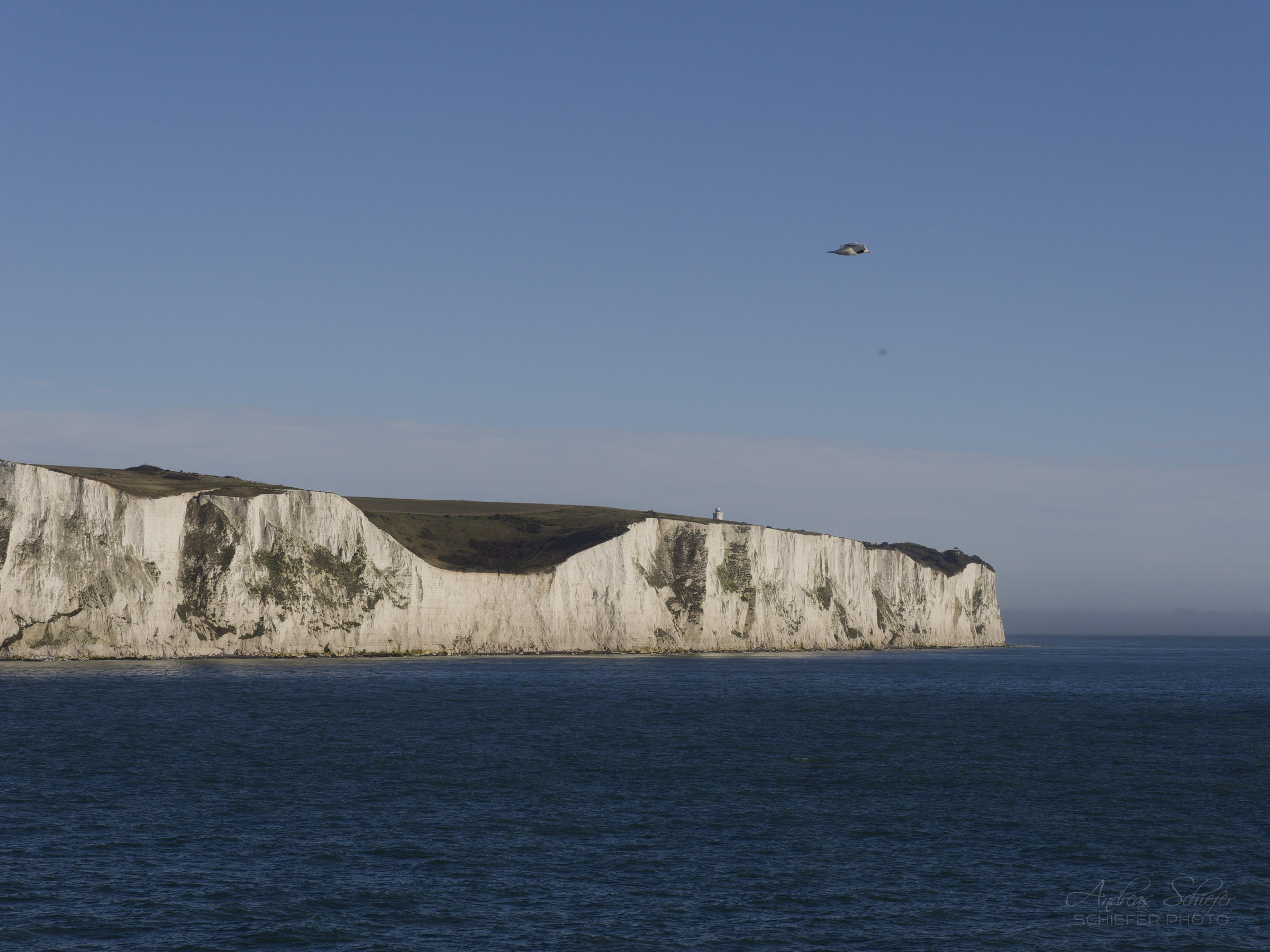 Ich ging raus und genoss die Seeluft. Die Sonne strahlte und nahm dem Wind die Kälte. Begleitet von Möven und anderen Seevögeln fuhren wir auf die Klippen von Dover zu. Während des Anlegens drängte sich eine Möwe ins Bild.